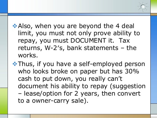 Home, but, because of a past problem with their credit, they do not qualify for a mortgage loan from any conventional lenders. But you know a “guy” Second, there is a three property exception. Under this exception, the seller-financer is not ... Fetch Document